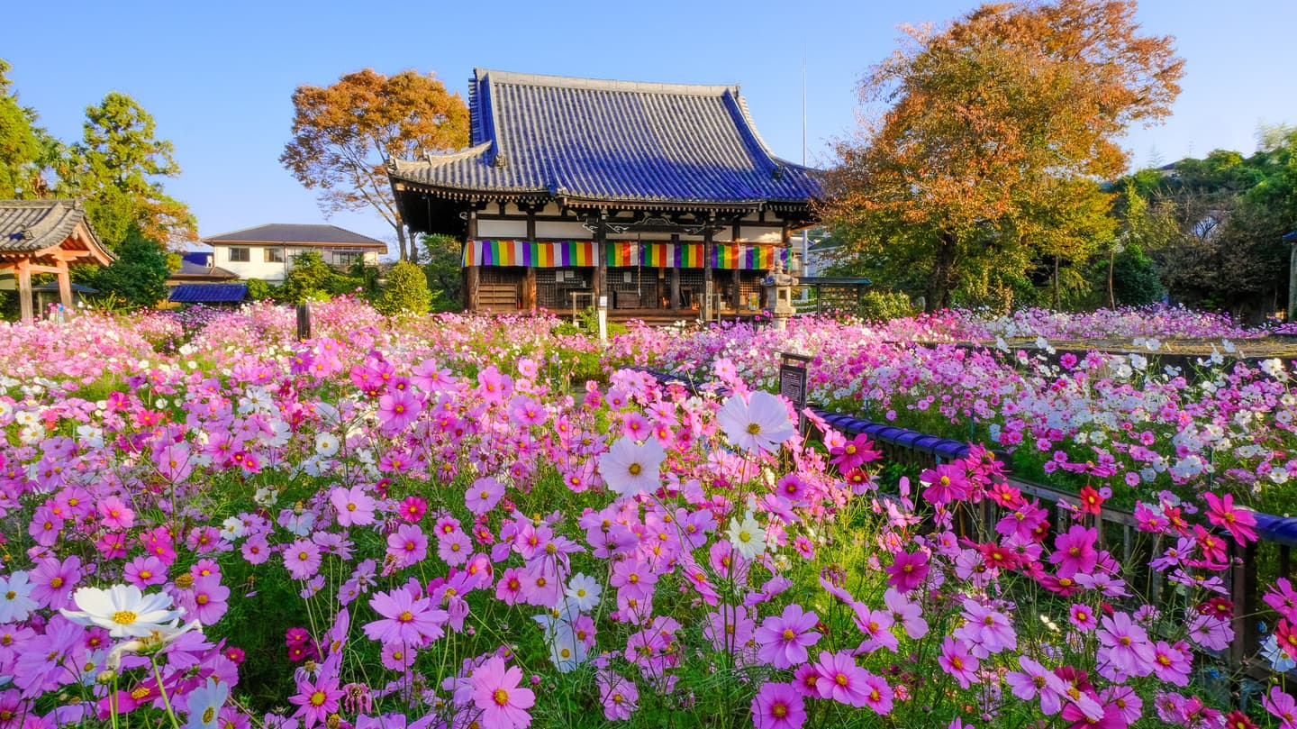 般若寺は「コスモス寺」の別名を持ち、秋には約15万本のコスモスが境内を彩ります。ピンク、白、赤、イエローと色とりどりの花々が咲き誇り、その景色はまるで花浄土のよう。風に揺れる可憐なコスモスが、訪れる人々をやさしく包み込みます。